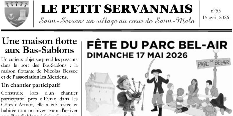 Partage Facebook Email Telegram WhatsApp Twitter Le Petit Servannais n°55 - avril 2026 Le Petit Servannais n°55, daté du 15 avril 2026 est sorti.Il est disponible en téléchargement ICI.Au sommaire :Une maison sur l’eau : dans le port des Bas-Sablons.Fête du Parc Bel-Air : dimanche 17 mai 2026.Forum de la condition animale : rencontres, informations et démonstrations, tous sur notre relation à la vie animale.Le saviez-vous? : le naufrage du « Pourquoi Pas? ».Appel à tous : venez rejoindre notre équipe et participer à la vie de notre quartier.Du côté de nos commerçants :Bettina : l‘élégance intemporelle à Saint-Servan. Téléchargez le Petit Servannais n°55